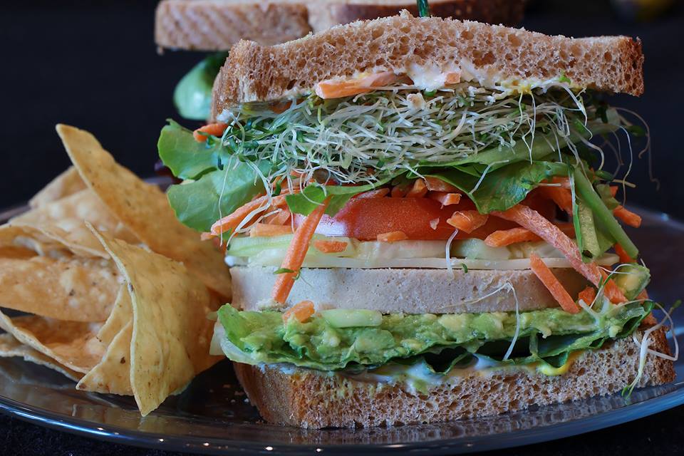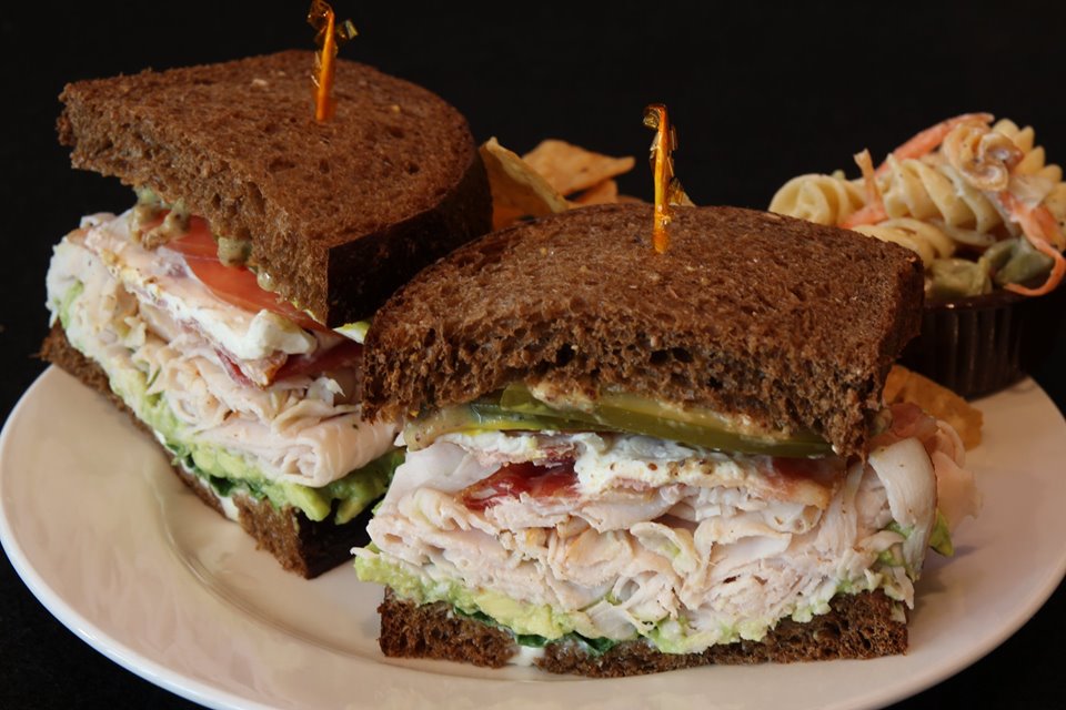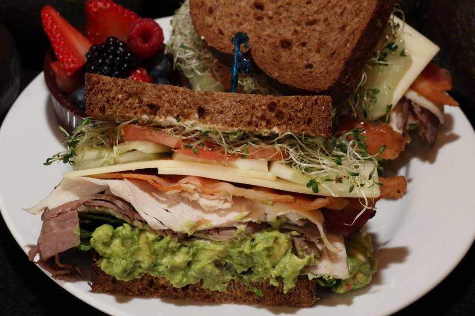 The Tower 9 sandwich is as tall as its name and loaded with homemade chicken salad, avocado, pepper jack cheese, sprouts, cucumber, tomato and spring mix, on squaw bread.