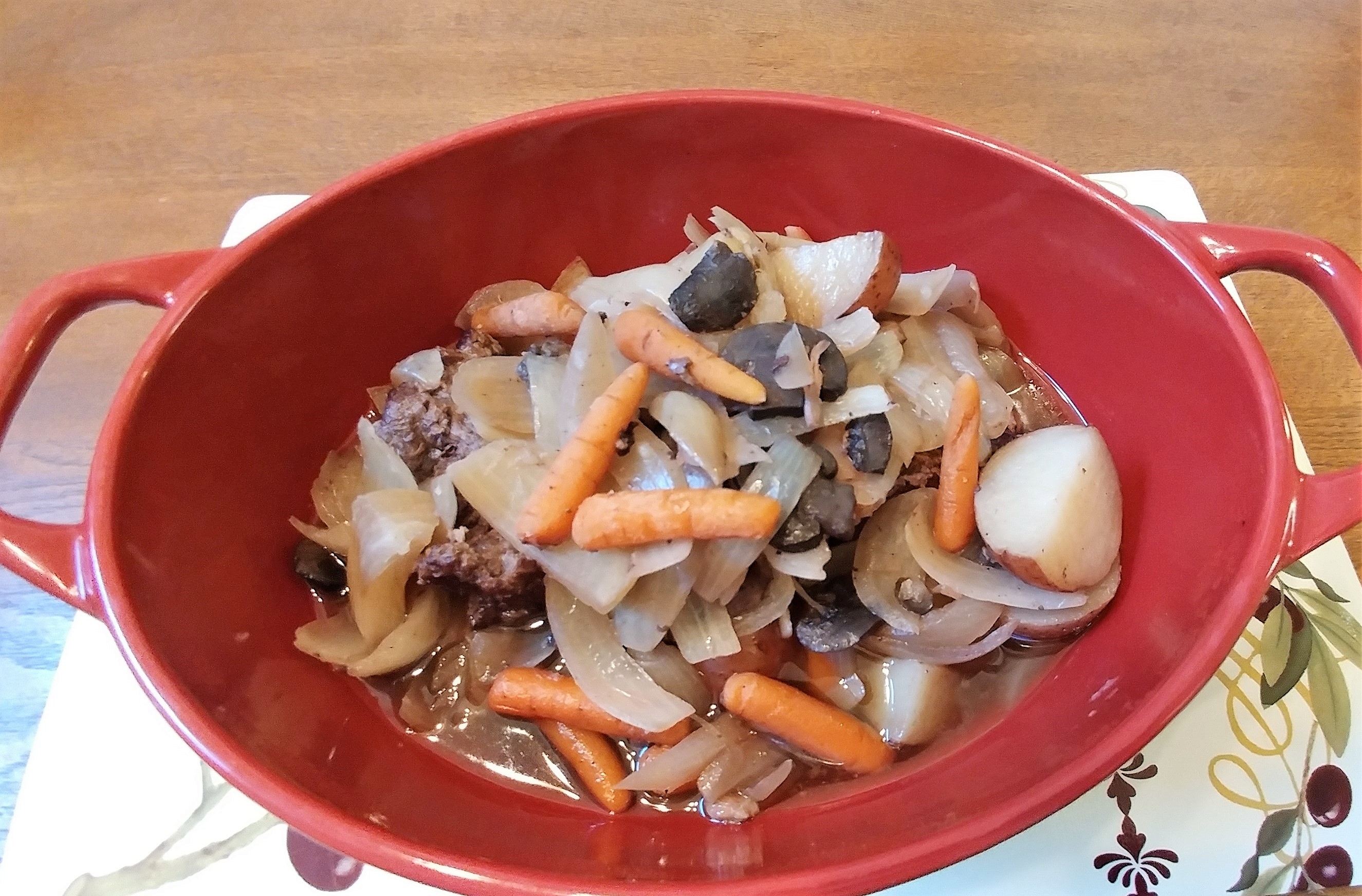 1.5 lbs beef stew meat, chopped into 1” pieces, 1 T. canola oil, 5 small red or purple small potatoes, 12 oz petite baby carrots or 3 large carrots (chopped), 1 yellow onion, chopped, 1 tsp minced garlic, 10 oz sliced cremini mushrooms, One 2.5 lbs butternut squash, peeled and chopped, 1 quart beef broth (4 cups).